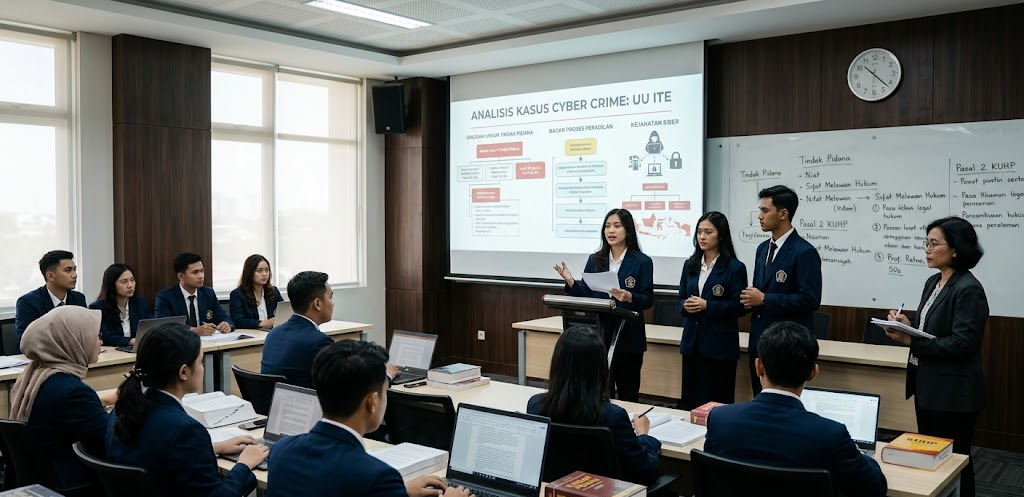 Misalnya, dalam kasus penipuan digital, mahasiswa menganalisis apakah terdapat rangkaian kebohongan, maksud menguntungkan diri sendiri, dan kerugian korban. Dalam kasus kejahatan siber, mereka mempelajari unsur akses ilegal, manipulasi data, atau gangguan sistem elektronik.