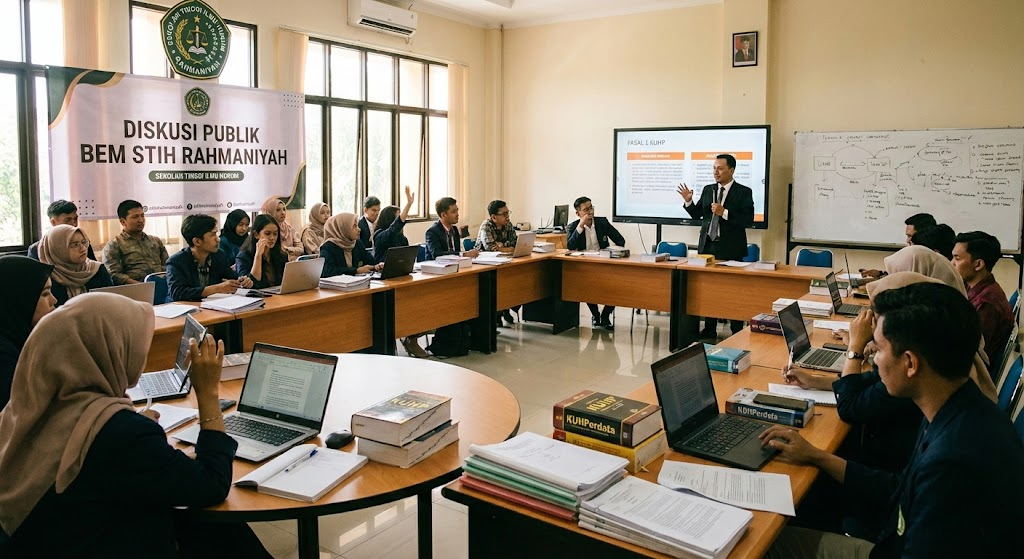 Pendidikan hukum bukan hanya soal membaca buku dan memahami teori-teori perundang-undangan, tetapi juga bagaimana mahasiswa mampu mengaplikasikan pengetahuan hukum tersebut dalam kehidupan nyata. Di tengah dinamika sosial dan perkembangan regulasi yang terus berubah, mahasiswa hukum dituntut untuk memiliki wawasan yang luas, analisis kritis, dan kemampuan berkomunikasi yang efektif. Salah satu cara yang efektif untuk mencapai hal tersebut adalah melalui kegiatan diskusi publik yang diselenggarakan oleh Badan Eksekutif Mahasiswa (BEM) Sekolah Tinggi Ilmu Hukum Rahmaniyah. Kegiatan ini tidak hanya memberikan ruang bagi mahasiswa untuk mengembangkan pemikiran kritis, tetapi juga membangun kesadaran mereka terhadap peran hukum dalam masyarakat.